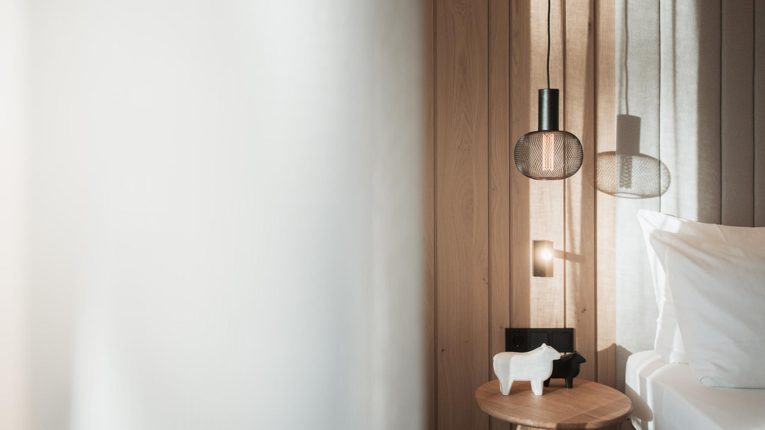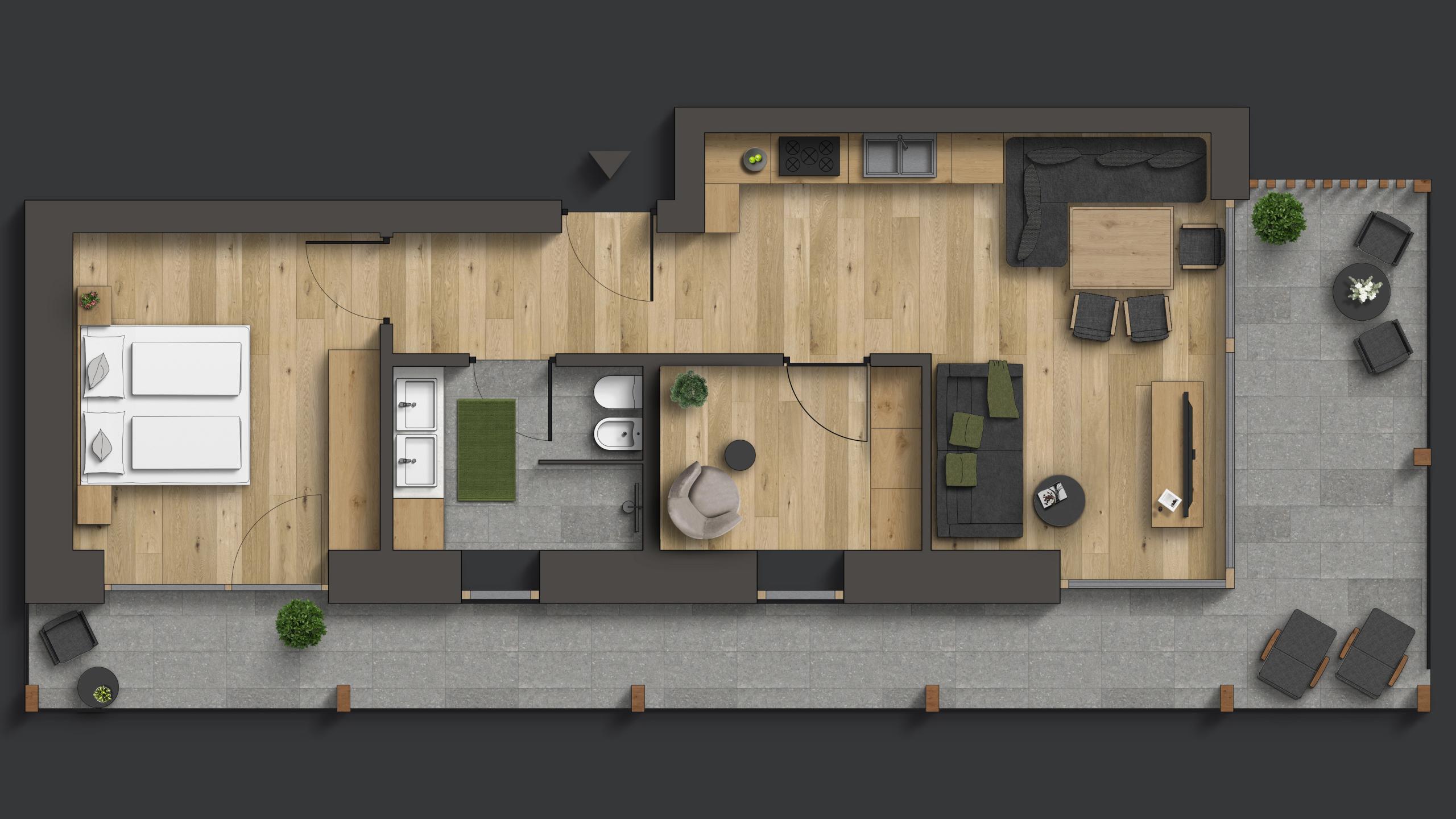 The MOUNTAIN SUITE is your stylish retreat for the highest demands, located just a few steps from the Boutiquehotel in our brand-new Mountain Residence. Experience a place full of generous space and limitless panoramic views. The suite indulges you with a spacious living area and a fully equipped kitchen. The true highlight is the continuous glass front on the south side which brings the majestic mountain world directly into your suite. Savour the end of the day in your private garden or on your 32 m² covered terrace – perfect for enjoying the sun in summer and the stars in winter.