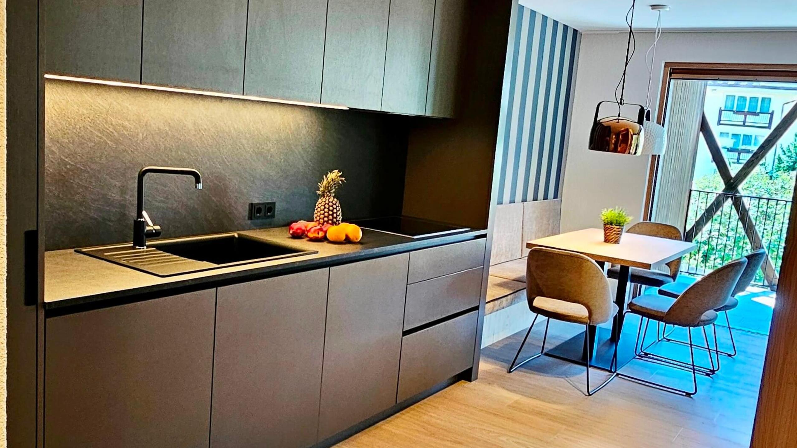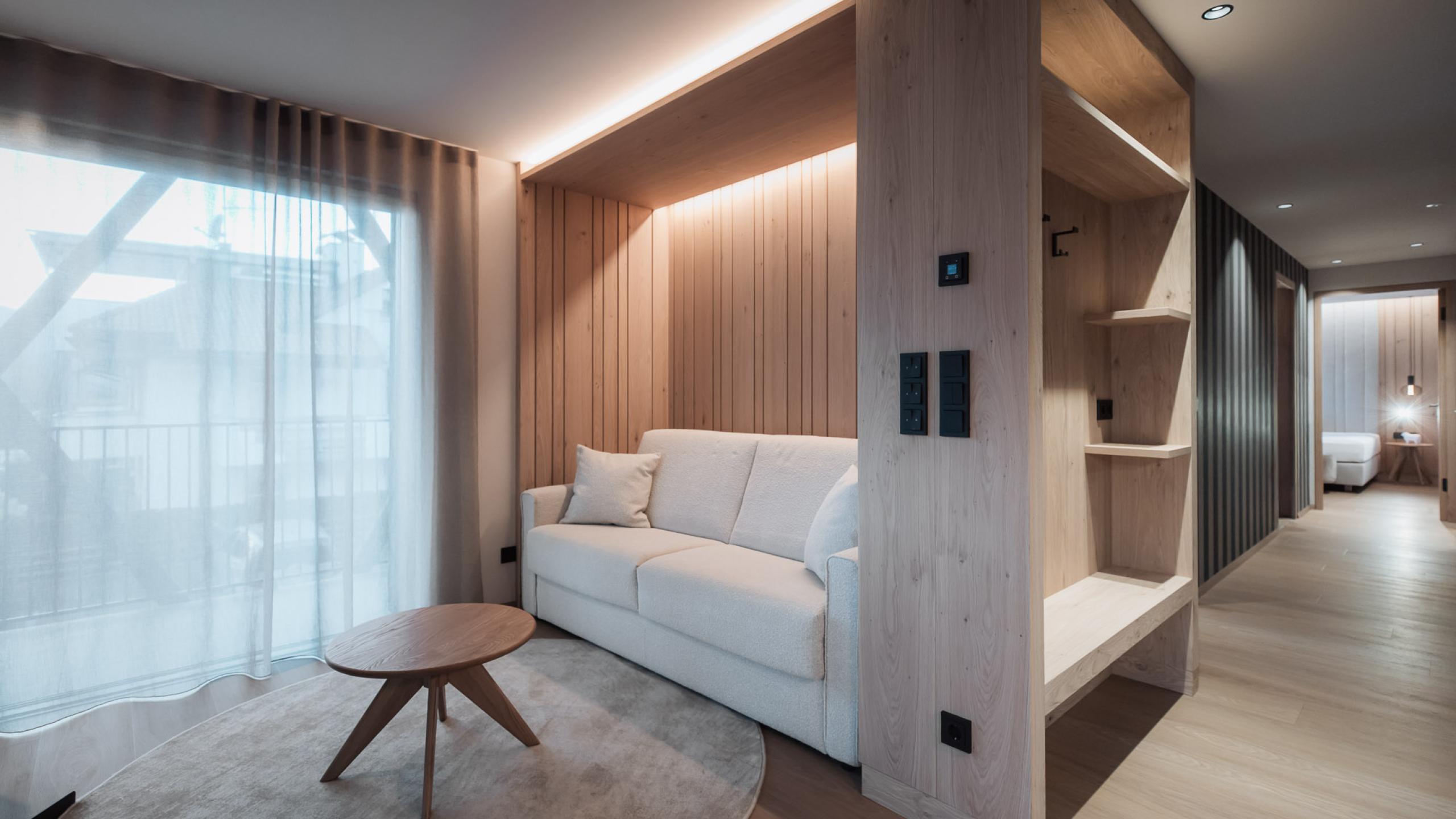 Die Suite verwöhnt Sie mit einem weitläufigen Wohnbereich und einer voll ausgestatteten Küche. Das wahre Highlight ist die durchgehende Glasfront auf der Südseite, die die majestätische Bergwelt direkt in Ihre Suite holt. Lassen Sie den Tag genüsslich in Ihrem privaten Garten oder auf Ihrer 32 m² großen, überdachten Terrasse ausklingen– perfekt, um im Sommer die Sonne und im Winter die Sterne zu genießen.