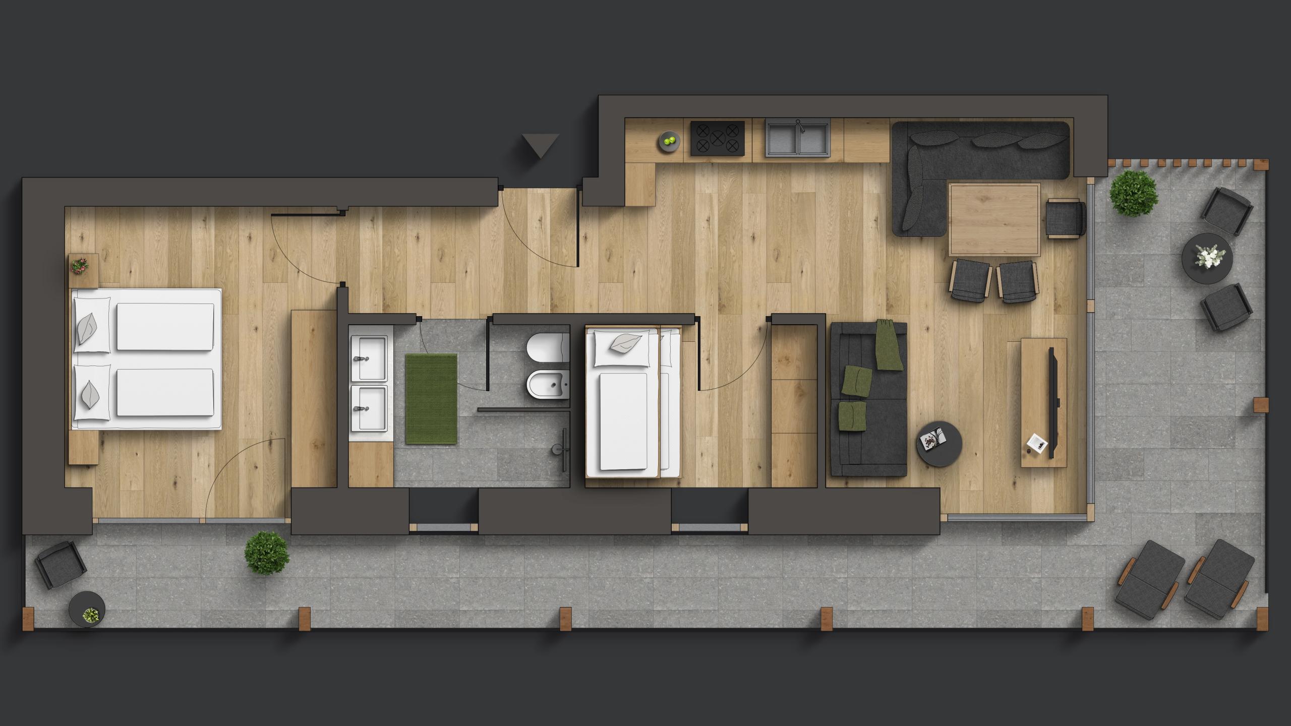 Zimmer mit Doppelbett | Wohnzimmer mit ausziehbarer Schlafcouch und Esstisch | voll ausgestattete Küchenzeile mit Spülmaschine | Flat-TV, Safe, WLAN | Badezimmer mit Dusche, WC, Bidet und Fön | privater Garten im Erdgeschoss oder mit großer Terrasse im ersten Stock