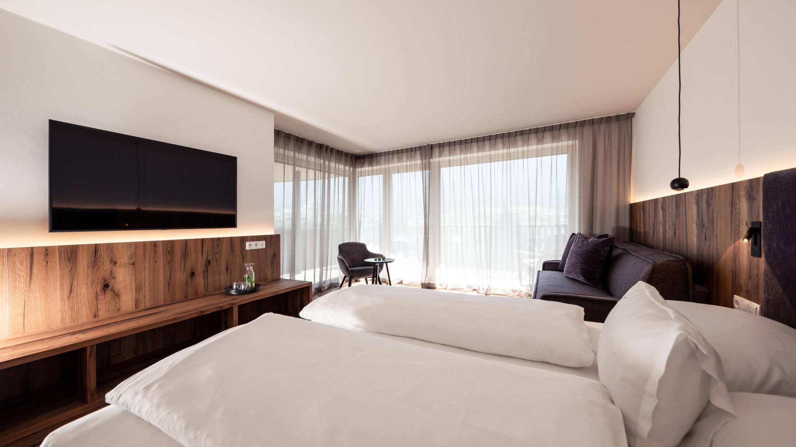 Benvenuti nella camera familiare più grande e bella del Clara! La camera PANORAMA FAMILY si trova all'ultimo piano, sul lato sud, e offre tanto spazio per grandi e piccini e un'atmosfera di benessere squisita grazie all'elegante pavimento in legno e al design alpino moderno. L'highlight per tutta la famiglia: la vostra cabina a infrarossi privata assicura calore rigenerante e recupero. La vista mozzafiato dal balcone sul Plan de Corones rende indimenticabile ogni momento. Il sogno alpino a portata di mano...