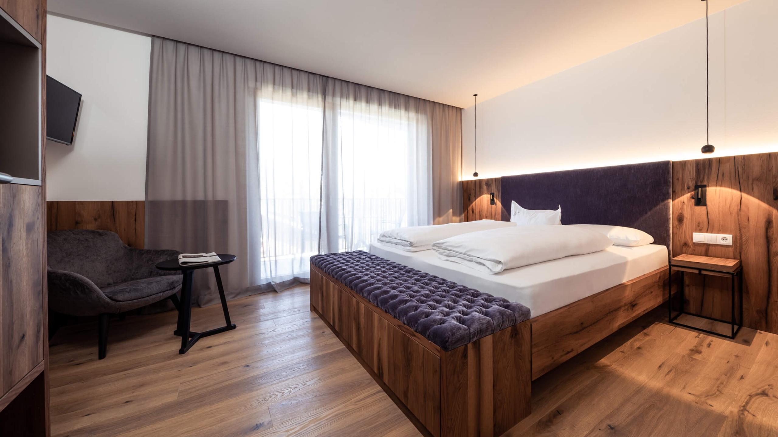 Das NATURE Zimmer ist einer der charmantesten Rückzugsorte des Hauses – geschaffen für Romantiker und alle, die der Natur ganz nah sein möchten. Warmer Holzboden und eine Einrichtung im modernen Alpenstil umfangen Sie mit wohliger Gemütlichkeit. Ihr privater, möblierter Balkon wird zur Loge in die Bergwelt: Genießen Sie hier die traumhafte Aussicht auf den majestätischen Kronplatz oder die beeindruckende Rieserferner Gruppe.