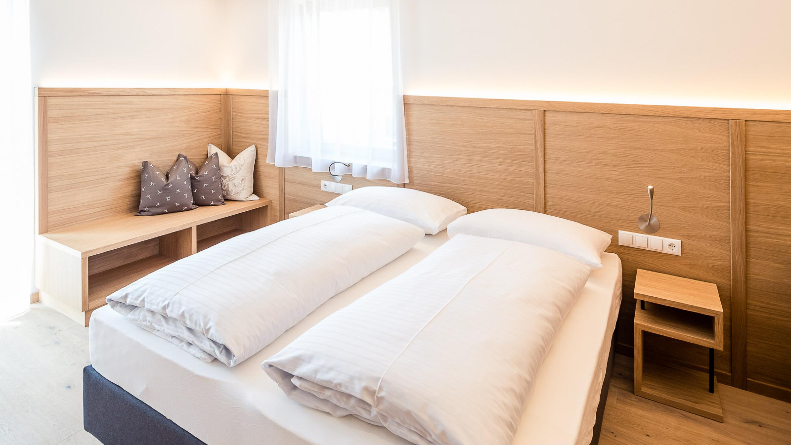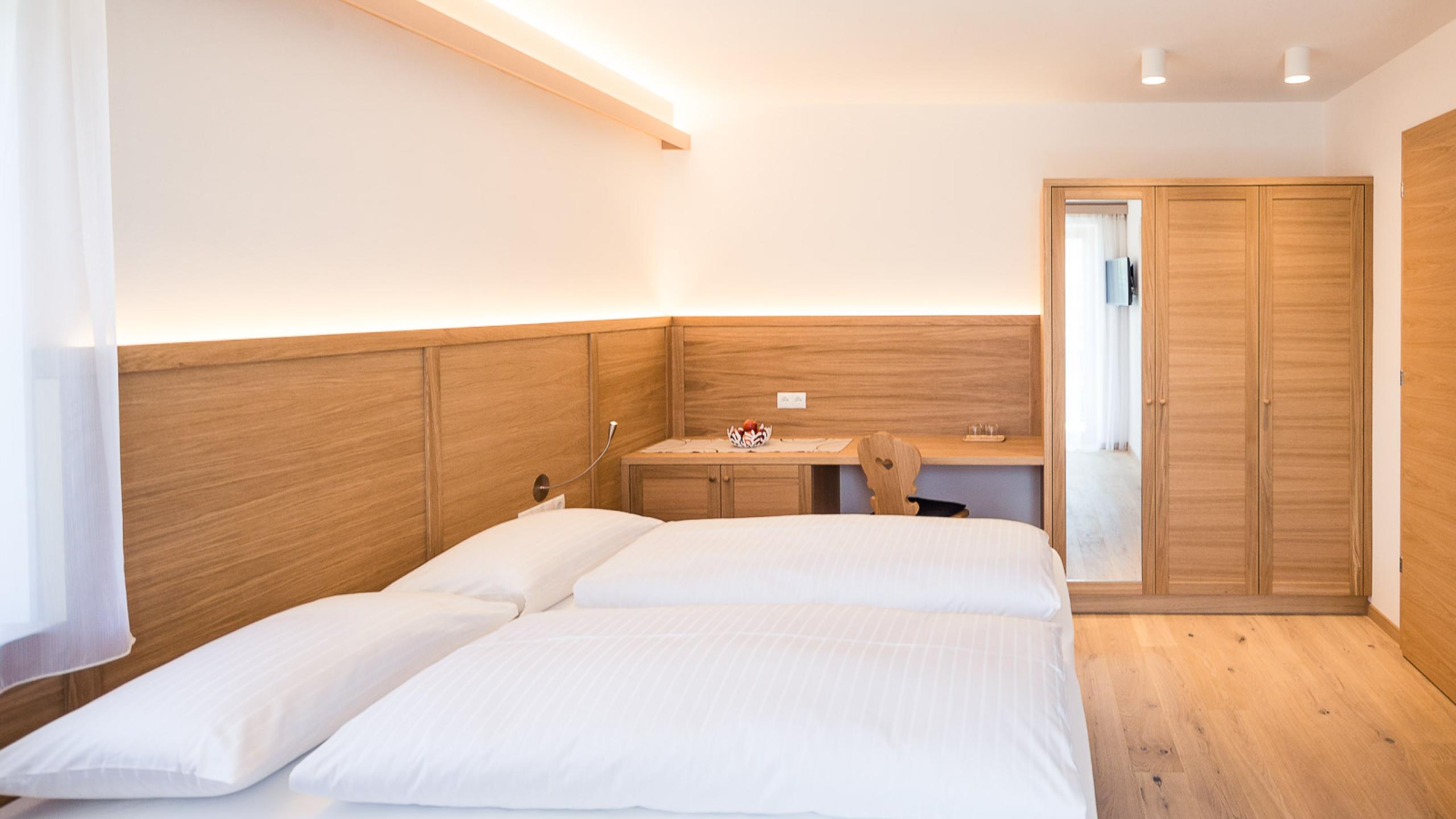 Allergiker-Zimmer mit Doppelbett | Massivholzmöbel und Holzboden | Flat-TV, Safe, Mini-Kühlschrank, WLAN | Badezimmer mit Dusche, WC und Föhn | möblierter Balkon